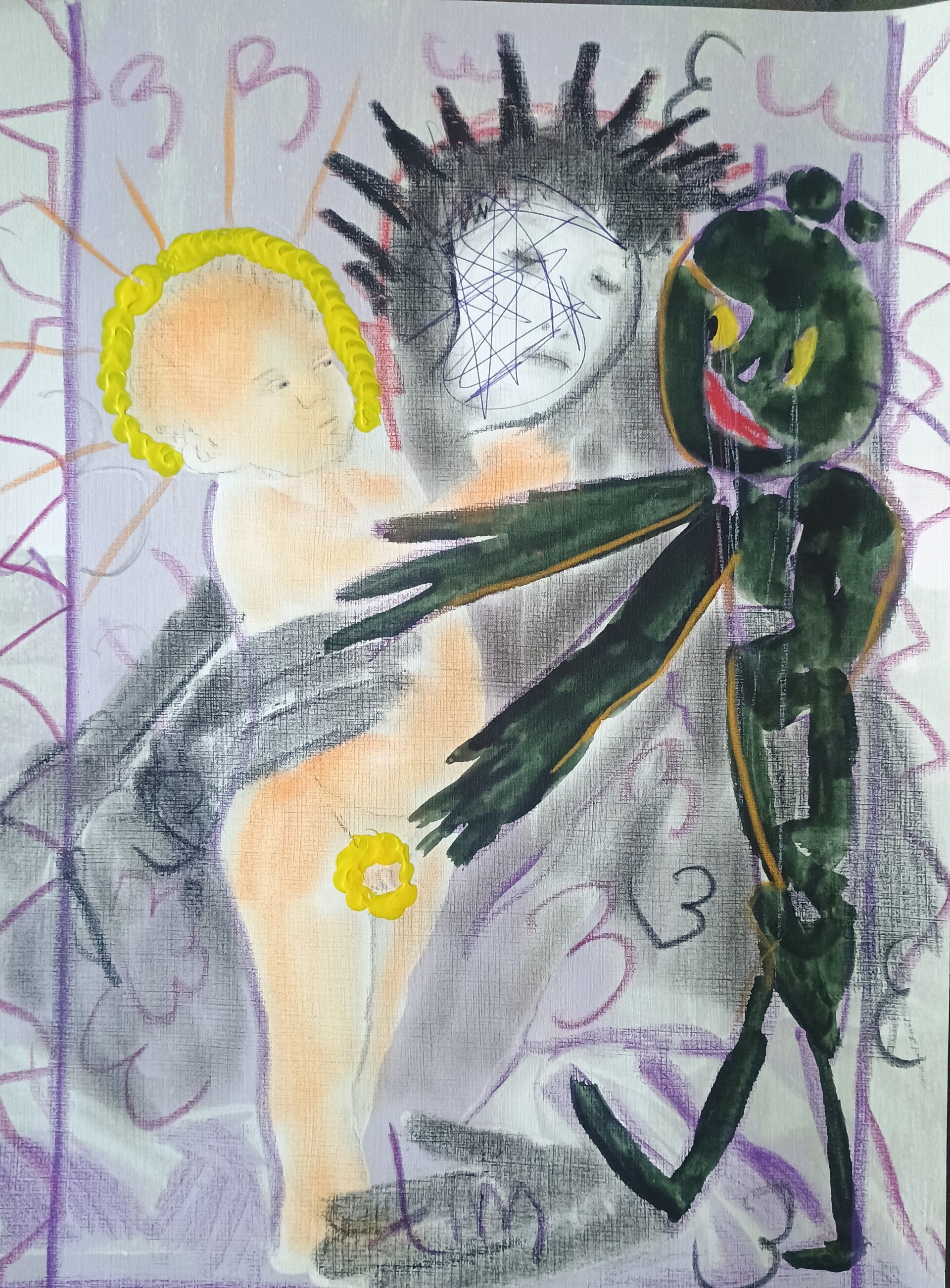 Mixed media on oil paint paper, 30 x 40 cm. Outlines in Neocolor oil pastel by Tim; mixed media [ink, bister ink, pan pastel, oil pastel, ink pen, and varnish] by Jimmy, 2026 .