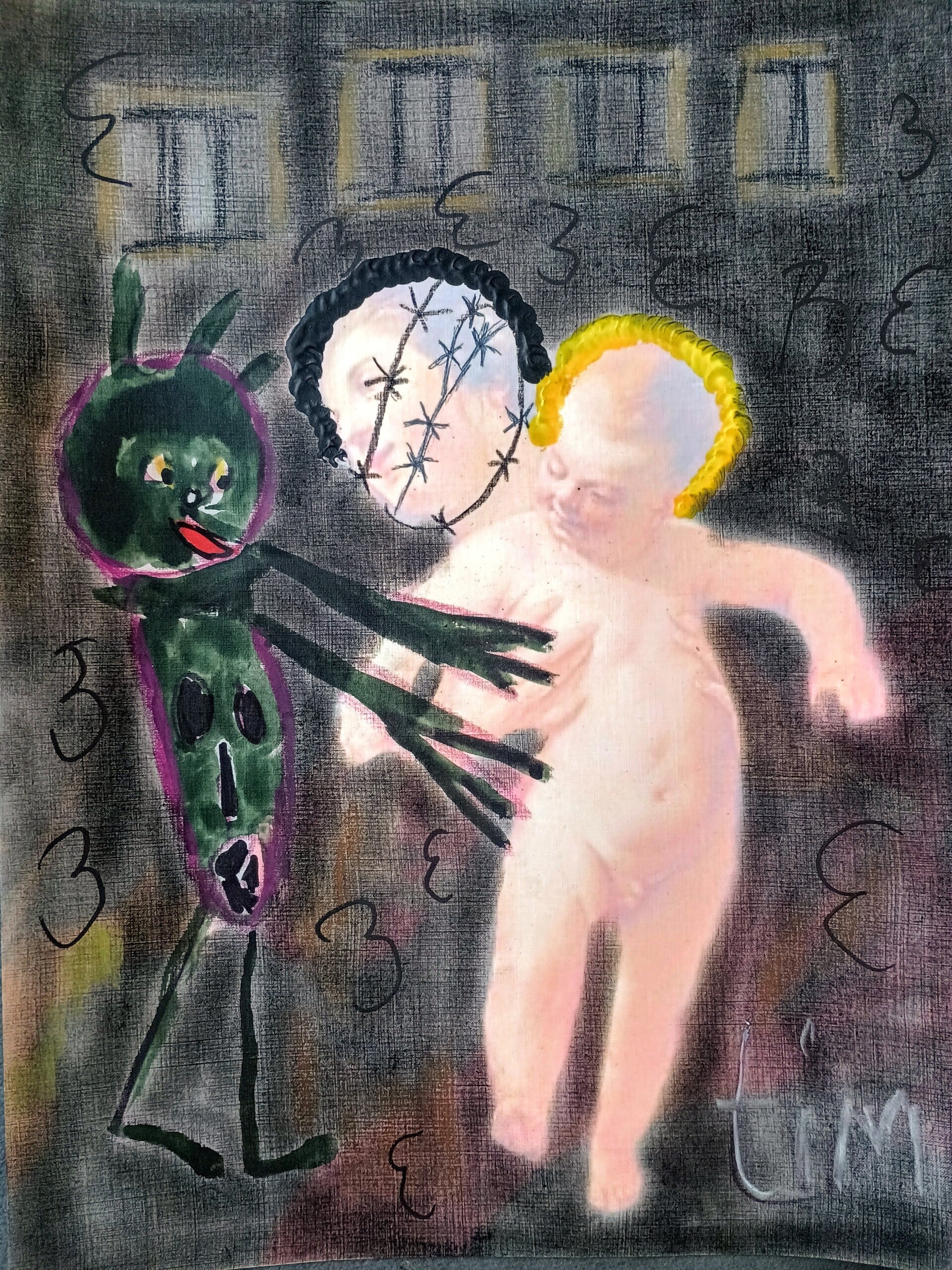 Tim cannot fight the system with words, but he can "draw back." In each piece, the divine is interrupted. He captures the desperate search for intimacy among the forgotten, while simultaneously crossing out the Holy Mother. It is an unholy world rendered in ink and oil, where the search for love becomes an act of quiet, visual rebellion.